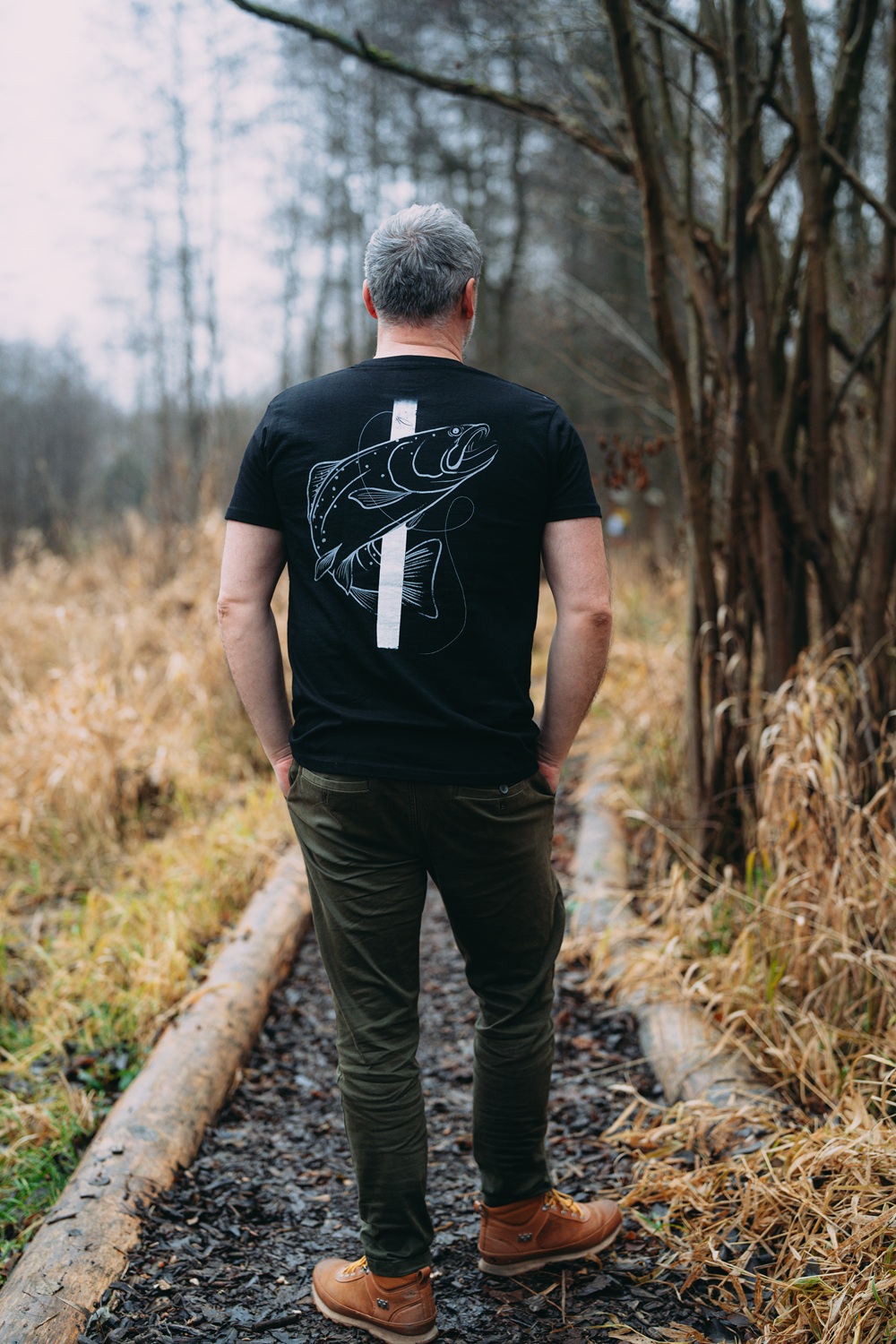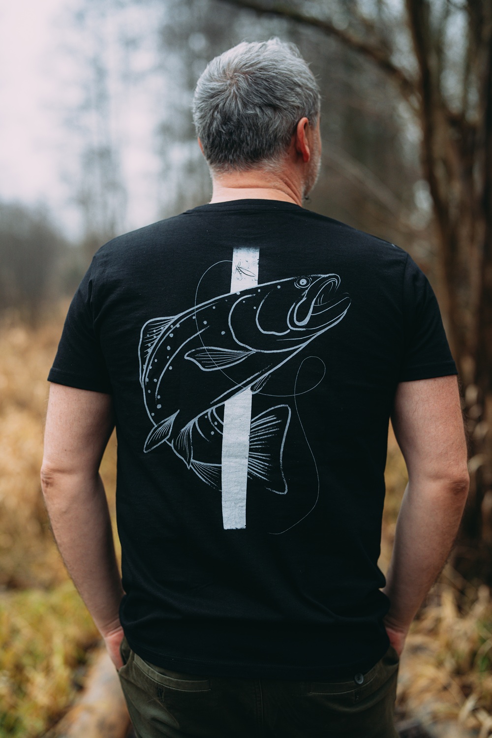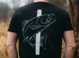 Kvalitní pánské tričko v černé barvě s naším originálním designem pstruha na zádech.