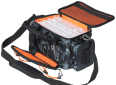 Větší vláčecí taška s popruhem přes rameno, která obsahuje čtyři větší krabičky na nástrahy.